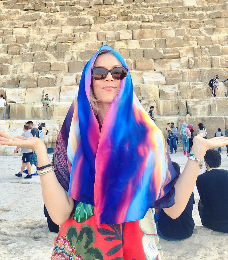 Regular price $84.99 Sale price $84.99FIRE IN THE SKY SCARF at fhe Great Pyramid of Ginza, Egypt. This globetrotter loves style, practical style when traveling. "I wore it over my head, over my shoulders, could wear it as a sarong..." Versatile and beautiful, sunset energy.