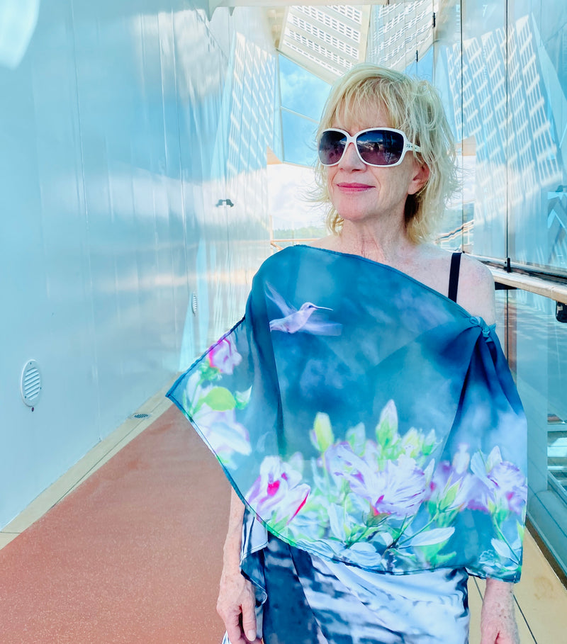 HUMMINGBIRD SCARF I own 4 scarves - so far! We moved from Chicago to Florida and left behind seasons of clothing. Now summer is my season and these beautiful scarves so easy to wear. Daytime casual and great coverup for dinner out. This pic from a recent cruise - So many Compliments! Love The Hummingbird!